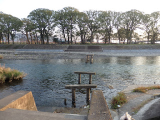 これは大雨の増水時には橋が浮き上がって外れ 水位が収まればまた掛けなおす、ということで水害に対処できる構造になっていたらしいが、何年か前の水害で橋脚の部分にダメージを受けて 現在はこの状態なんだそうな。