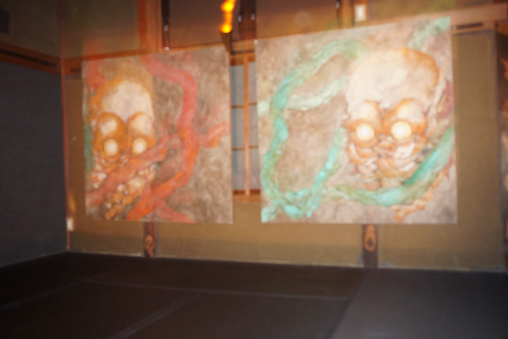 他にお客がいなかったんでフラッシュを点灯しての撮影だが しばらく暗い部屋にいると目が慣れてきて 徐々に妖怪アートが浮かび上がってくる、という趣向じゃ。